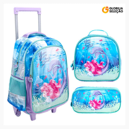 Kit Mochila Escolar Infantil de Rodinhas Feminina Bolsa Resistente Impermeável Com Lancheira e Estojo